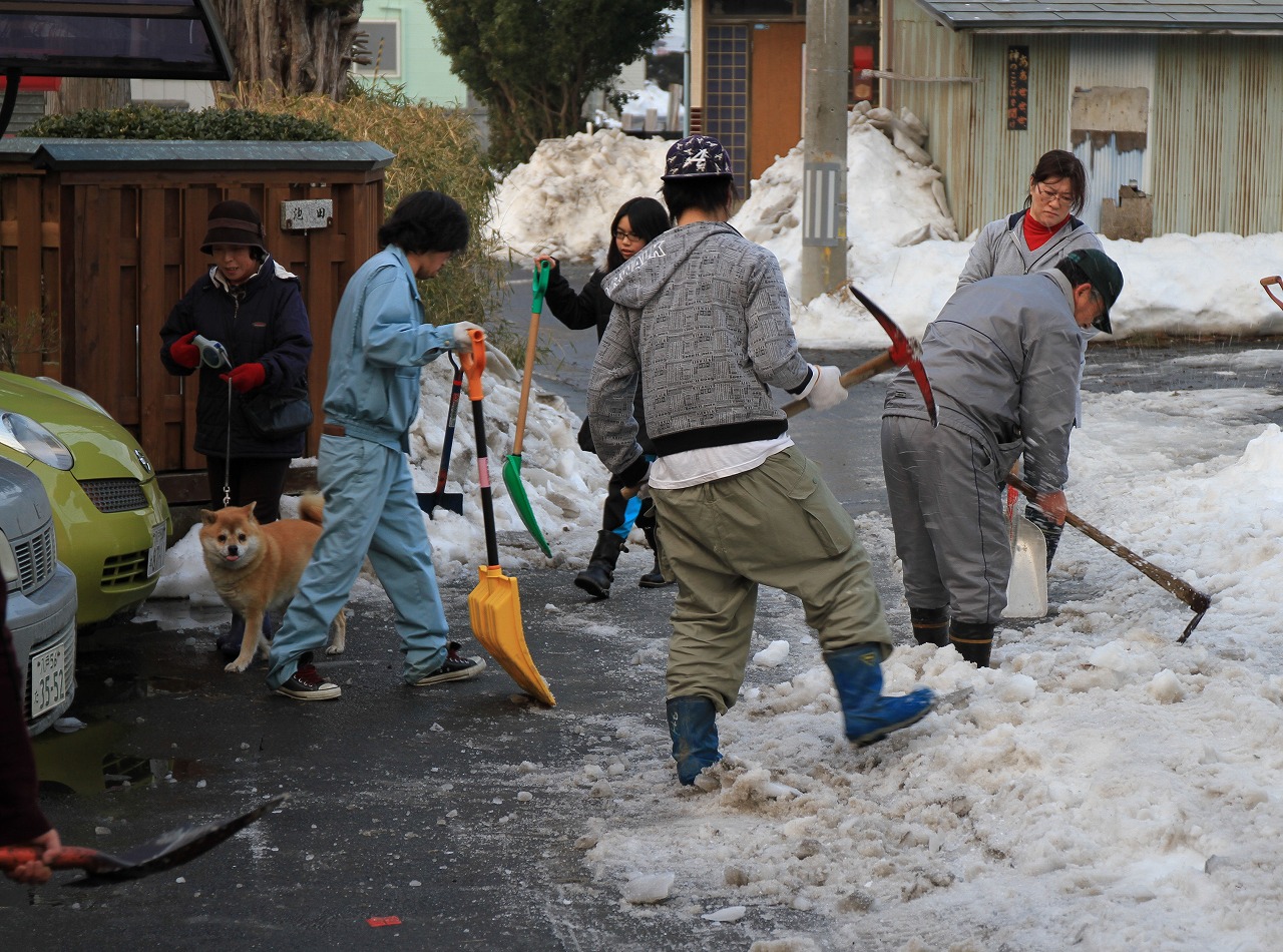 ツルハシ、スコップ、等々手に、隣近所の方々のおかげで凸凹の雪道は